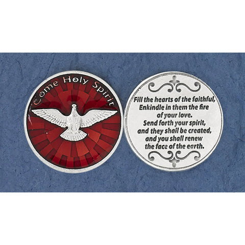 Silver Toned Pocket Token with "Come Holy Spirit" written on the front above a dove. The reverse continues, "Fill the hearts of the faithful and kindle in them the fire of Your Divine love. Send forth Your spirit, and they shall be created, and You shall renew the face of the earth." Coin has red enamel on the front.